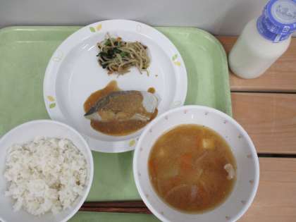 「麦ごはん、鰆のごまだれかけ、野菜の海苔和え、豚汁、牛乳」です。