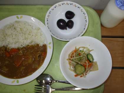 「カレーライス、こんにゃくサラダ、巨峰、牛乳」です。