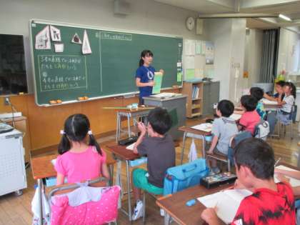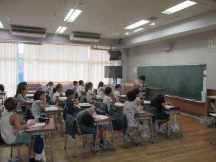 2年生の授業風景です。1組は、国語の「夏休みの思い出」の発表を、2組は算数の「三角形と四角形」を、3組は国語の「何をつたえようとしているの」の単元でした。どのクラスも落ち着いて取り組んでいました。