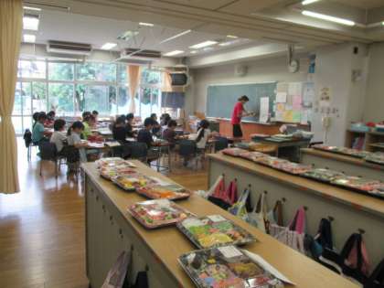 2年生のロッカーの上には、図工でつくった美味しそうな「お弁当」が乗っています。「お弁当」が仕上がるのも楽しみです。