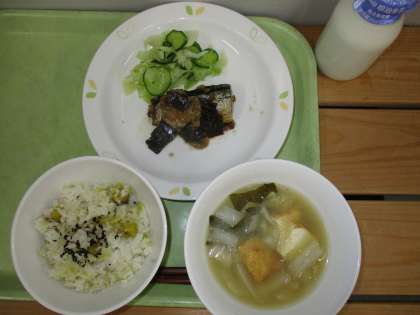 「さつま芋ごはん、秋刀魚の松前煮、野菜のごま風味、生揚げの味噌汁、牛乳」です。