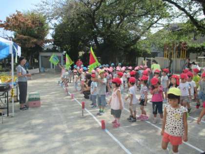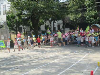 八幡山幼稚園では、保護者の方のお手伝いも参加して、運動会の予行の1回目を行いました。開会式では、年長さんが旗を持っての入場です。年少さんも立派に整列できました。