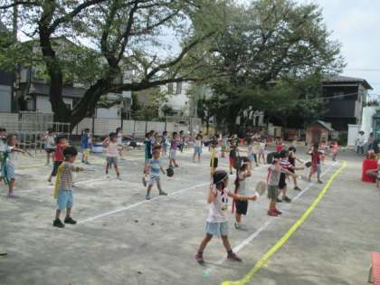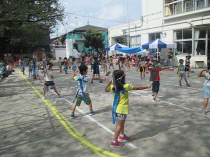 八幡山幼稚園では、2回目の運動会の予行を行いました。年長組のリズム「これがにほんのおまつりさ」を練習しました。とてもかっこう良かったので、年少組さんから思わず拍手が起きました。その後、園庭では年少さんが、真似をして踊っていました。本番をお楽しみに!