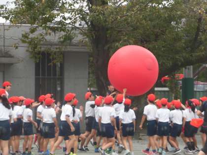 今日は全校朝会があり、そのまま一時間目に全校練習を行いました。応援合戦や大玉送り(全校競技)の練習をしました。応援団のキャラクター旗がかっこよく翻っています。あか組「ファイヤーホース」、しろ組「ほっきょくぐま」どちらも強そうです。