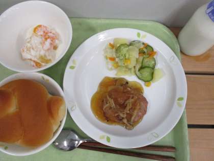 「ミルクパン、ハンバーグ、ポテト入りフレンチサラダ、フルーツヨーグルト、牛乳」です。