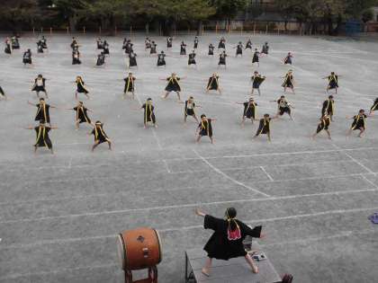 4年生は手作りのハッピを着て練習しました。ハッピには自分たちが好きな漢字が一文字入れてあります。悠々と踊る姿にたくましさを感じました。