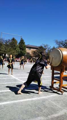 4年生のリズムは、八幡山小伝統の「八幡山ソーラン」です。ソーランの半被の背中の文字は子どもたちが自分で選びました。それぞれに意味があります。その文字を背負って、かっこよく踊りました。