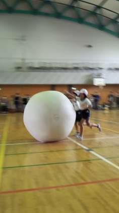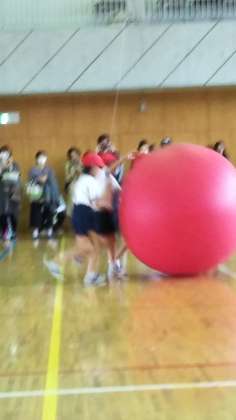 大玉を3人か2人で運びます。勝負は、泣いても笑っても1回限りです。さぁどちらが勝つでしょうか。