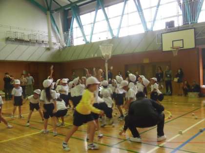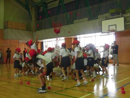 エビカニックスの曲で踊る「ダンシング玉入れ」です。練習の時よりもいっぱい玉がかごに入っています。