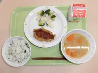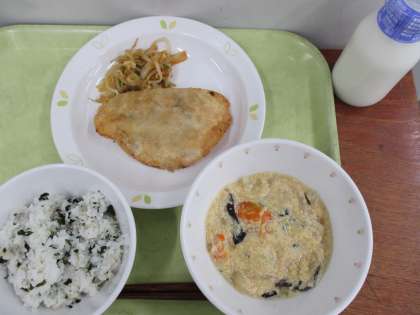 「わかめごはん、ジャンボ餃子、白菜の中華サラダ、卵スープ、牛乳」です。