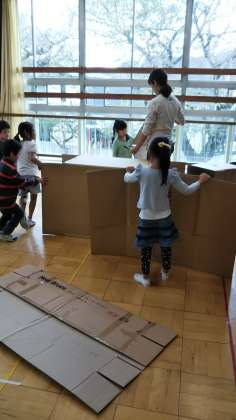 「くらげのめいろ」グループは、段ボールで壁を作っていました。