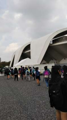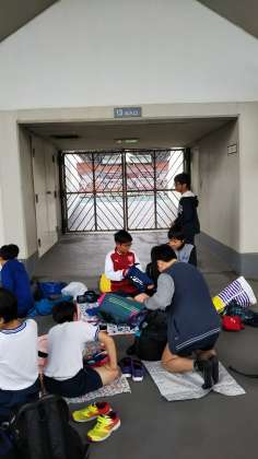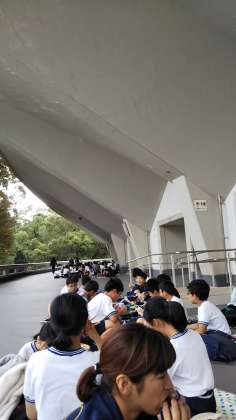 6年生は、駒沢競技場で連合運動会に参加しました。午後の部なのでバスで移動した後競技場のウォーミングアップの場所でお昼をとりました。もうすぐ、開会式です。