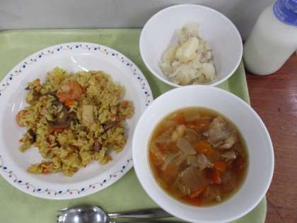 「洋風炊き込みごはん、ジャーマンポテト、白いんげん豆の田舎風スープ、牛乳」です。