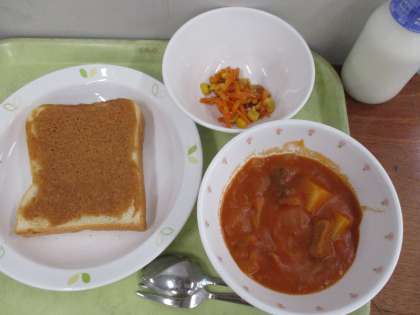 「きな粉バタートースト、人参サラダ、トマトシチュー、牛乳」です。