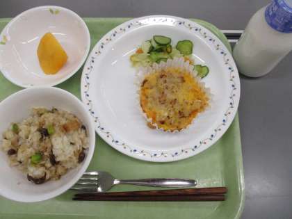 「まめまめおこわ、切干大根の卵焼き、野菜のごま風味、柿、牛乳」です。