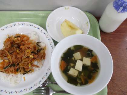 「豚キムチ丼、わかめスープ、りんご、牛乳」です。