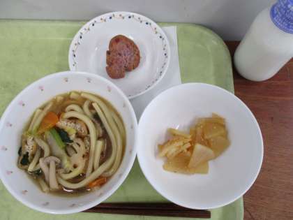 「ちゃんこうどん、大根の中華味、紅芋サーターアンダギー、牛乳」です。