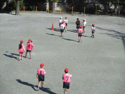 4年生は、校庭でゴール型ゲーム「サッカー」を行っていました。