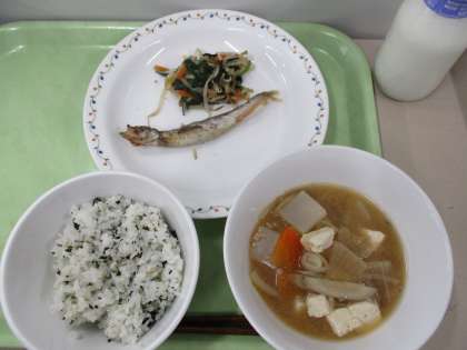 「麦わかめごはん、ししゃもの唐揚げ、野菜の海苔和え、にんじんとごぼうとだいこんの豚汁、牛乳」です。