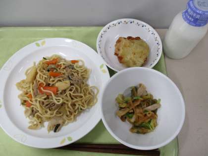 「塩焼きそば、白菜の中華サラダ、さつま芋のごま団子、牛乳」です。