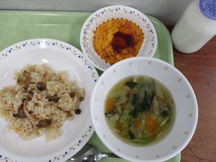 「きのこピラフ、チーズ入り卵焼き、野菜スープ、牛乳」です。