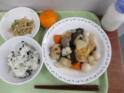 「わかめごはん、おでん、ごま酢かけ、みかん、牛乳」です。
