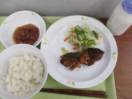 「麦ごはん、鯖の竜田揚げ、野菜の甘酢かけ、煮豆、牛乳」です。