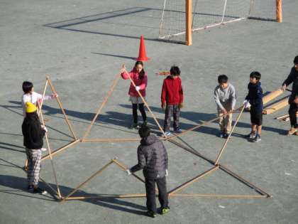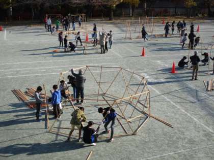 6年生の図工で、一級建築士の皆さんをゲストに空間ワークショップ「まちをつくろう」の活動を行いました。180センチと90センチの角材を使って組み立てます。接続は太い輪ゴムで止めていきます。各グループとも熱心に作業をしていました。