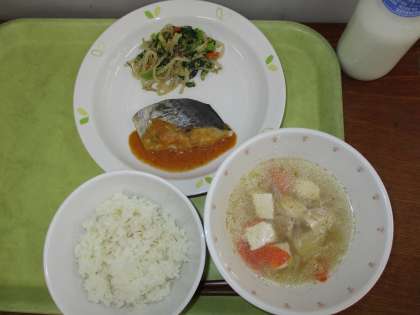 「麦ごはん、鰆のピリ辛ソースかけ、野菜のごま和え、豆腐汁、牛乳」です。