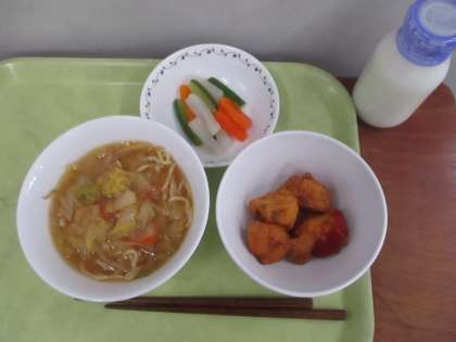 子どもたちにとても人気のある「ラーメン」です。味噌ラーメンは札幌のラーメン屋さんが考案し、全国に広まったものなので、味噌ラーメンと言えば札幌、札幌と言えば雪国…と連想され、「味噌ラーメンは冬の食べ物」というイメージも全国に広まったようです。味噌は発酵調味料なので血液の循環を促進する作用から身体を温める効果もあることから、効能的にも冬にふさわしいラーメンと言えます。今日はきっと、空の食缶がたくさん戻ってくることでしょう。