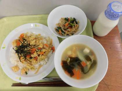 今日は、3年生の児童から「お母さんの作る親子丼と違う〜」と声をかけられました。我が家の親子丼とも違います。給食は食器の数が限られているので、いろいろな食材を食べさせたくても制限がかかります。なので、基本的な「親子丼」に、人参が入り、糸蒟蒻が入るわけです。