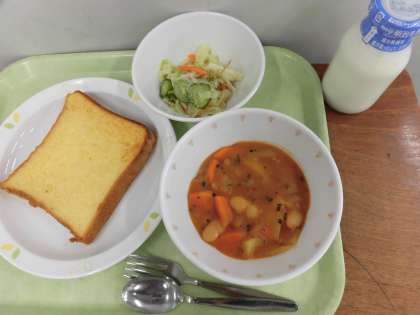 「フレンチトースト、ビーンズシチュー、牛蒡チップサラダ、牛乳」です。