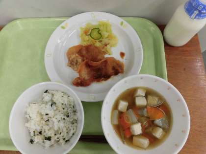 「麦わかめごはん、豚肉の南蛮揚げ、即席漬け、けんちん汁、牛乳」です。