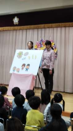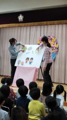 お誕生会のお楽しみは、「いたいのいたいのとんでいけ」という先生たちによるペープサートでした。皆で、大きな声で「いたいのいたいのとんでいけー!」と歌って楽しみました。