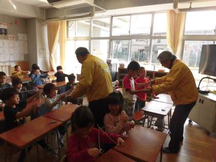 一年生は生活科で地域の方から「昔遊び」を教えてもらいました。校庭では竹とんぼの飛ばし方のコツを、教室では、こまや剣玉、あやとり、びゅんびゅんこまの技を教えてもらいました。一人ではできなかった児童も教えてもらってできるようになり嬉しそうな笑顔が見られました。手づくりの竹とんぼとびゅんびゅんごまは、児童にプレゼントしてくださいました。地域のみなさま、ありがとうございました!