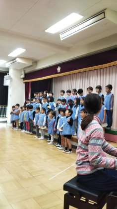 こどもかいの最後に、年長さんが全員集まって歌を披露しました。大きな声で素晴らしい歌声でした。園長先生と八幡山駐在所の武藤さんから、たくさん誉めて貰いました。年長さん頑張りました。