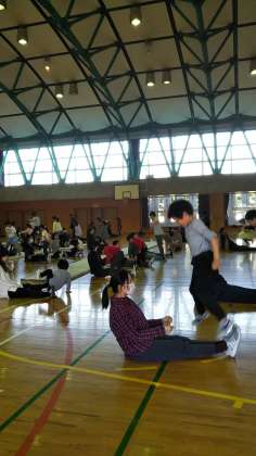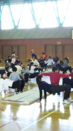 最初の柔軟体操で、早速「大人の人は固いですねー。」「無理しないでくださいね。四十肩、五十肩に効きますよ。」と子どもたちの身体の柔らかさを実感しました。