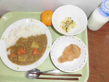 「なかよしカレーライス、チキンカツ、白菜とコーンのサラダ、ぽんかん、牛乳」です。