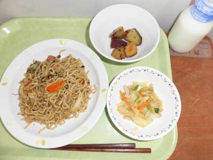 「ソース焼きそば、白菜の中華和え、大学芋、牛乳」です。