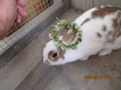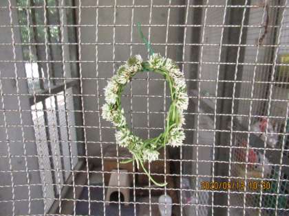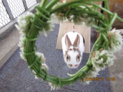 きょうは、とってもいいことがありました。モカのうちのカベに、「かわいらしいシロツメ草で作ったリース」が飾られていました。