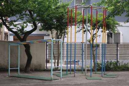 ようちえんの おにわには、のぼりぼうや うんていが あります。