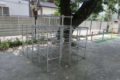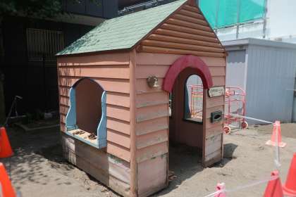 おにわには、じゃんぐるじむや てつぼう、さっかあごおるが あります。そして、ちいさな おうちまで あります。