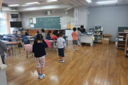 先生にプリントを見てもらうのも、ソーシャルディスタンスを守って並びます。