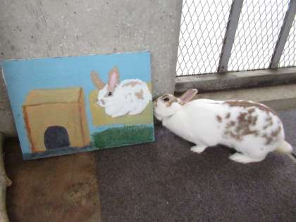 こんにちは。今日はすばらしいプレゼントが届きました。やっほー!!飛びはねて喜びました。えっ、どんなプレゼントかって?それはね、モカの絵なんです。とってもかわいらしくかいてくれました。ありがとう!!!どこにかざろうかな?