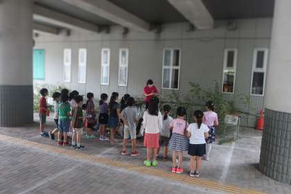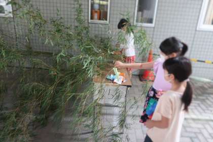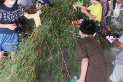 七夕の飾りや願い事の短冊を、笹ではなく竹につけました。