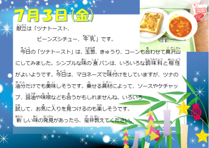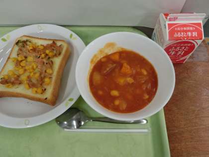 「ツナトースト、ビーンズシチュー、牛乳」です。