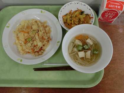 今日は七夕メニューです。天の川に見立てたそうめん、お星様に見立てたオクラ、短冊切りのにんじん等々で、七夕汁を作りました。出汁の香りよく、オクラの緑が映えるように醤油を少なめに仕上げてくれました。