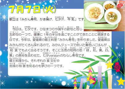 「みかん寿司、かき揚げ、七夕汁、牛乳」です。