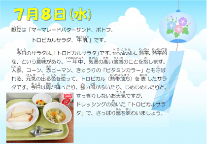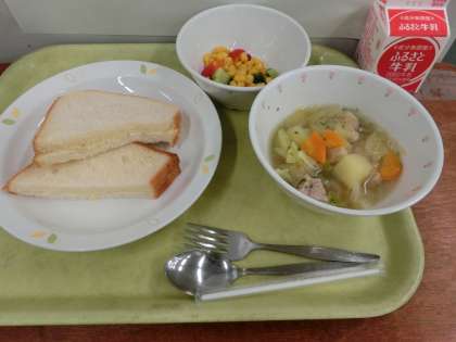「マーマレードバターサンド、ポトフ、トロピカルサラダ、牛乳」です。