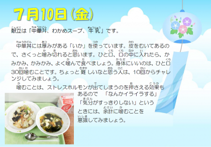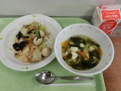 ごはんや麺に具やソースをかけるメニューは、配る量のバランスが難しいです。先日のジャージャン麺のときは、ソースが足りず麺が余ってしまったクラスもありました。今日は、その経験を生かしてか、具が余ってしまったクラスが多かったようです。中華丼ではウズラの卵の個数も大きく影響しますので、今日のお当番さんは大変だったことでしょう。